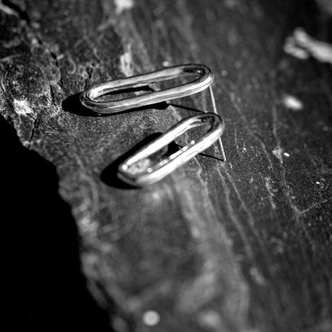 Lähtö Earring in Sterling Silver. Handformed elongated oval design.We make the silver earring in brushed silver or oxidized dark silver. Also available in golden bronze. Welcome to our store in Stockholm...